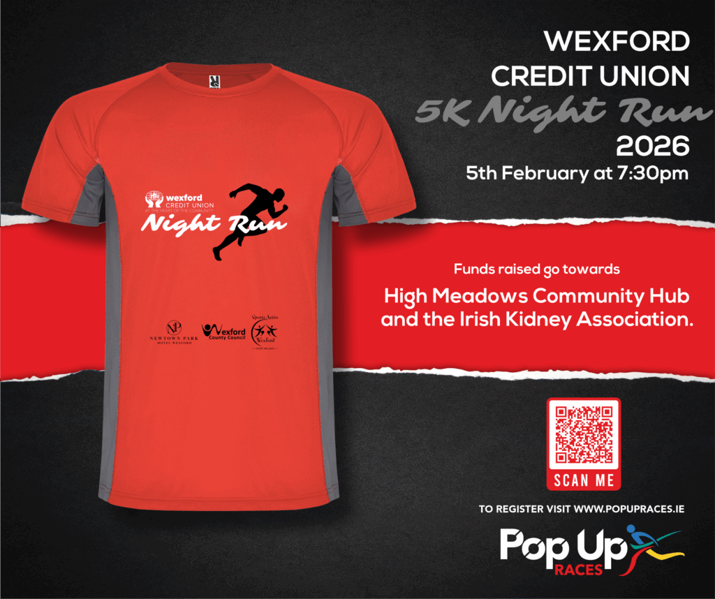 The Wexford Credit Union Night Run is back for 2026. This popular 5km race takes place on Thursday, February 5th at 7:30pm on the Quay in Wexford Town.
